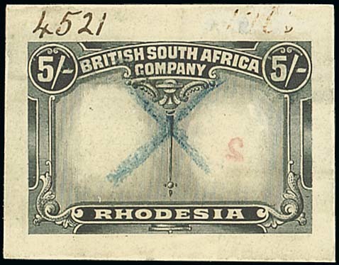 5/- frame in black on wove paper, die number "4521" at upper left corner and with blue crayon cross at centre, printer's reference number largely erased from upper right corner. Exceptionally rare, being one of only two such proofs for this value, the other being offered in the Gibbs sale. Photo