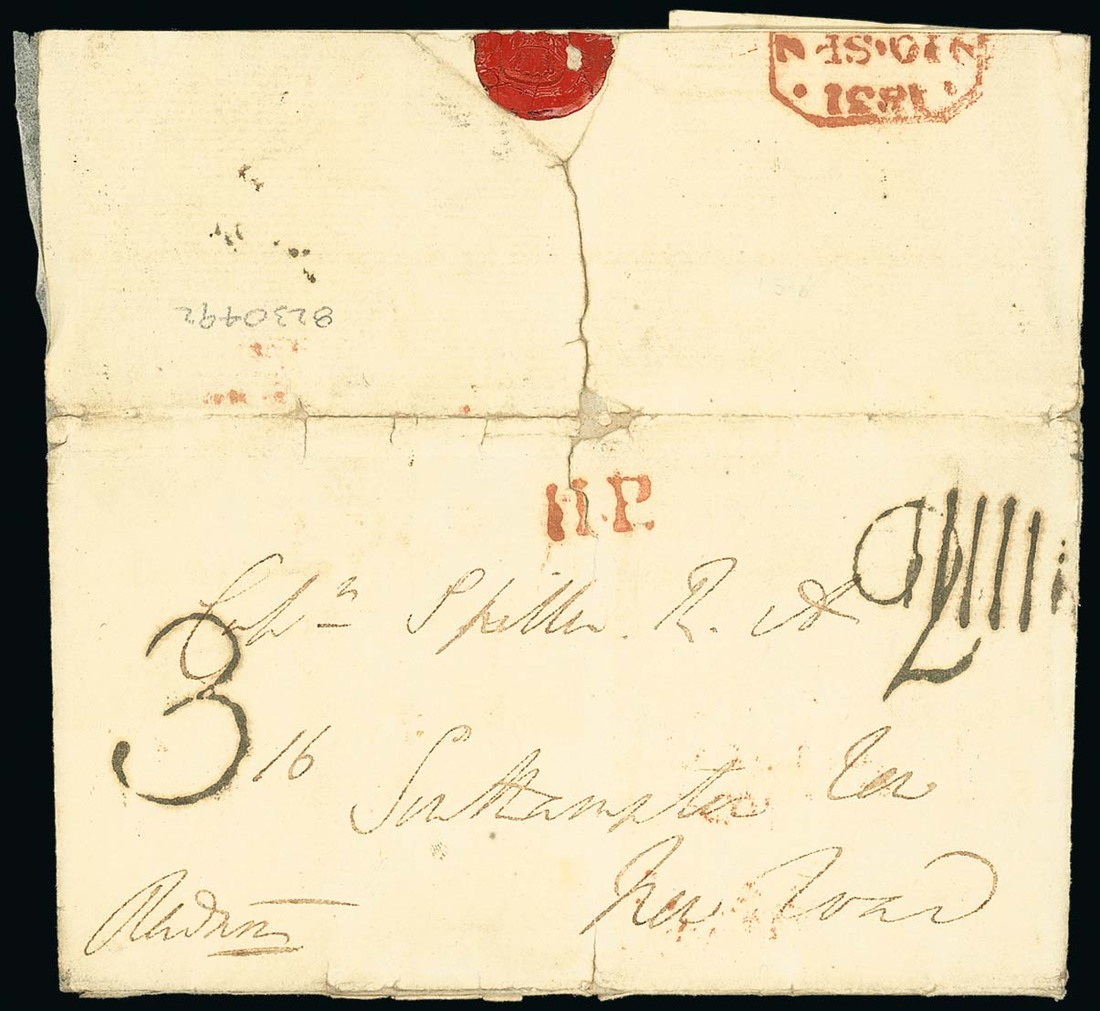 1831 (10 Sept.) entire letter to Capt Spiller in Southampton Row bearing a good strike of the small letter "H:P" handstamp in red, handstruck "2" overstamped by horizontal lines erasure handstamp and handstruck "3" at left, red boxed datestamp on the reverse and signed "Radnor"; some creasing and paper splitting. Photo