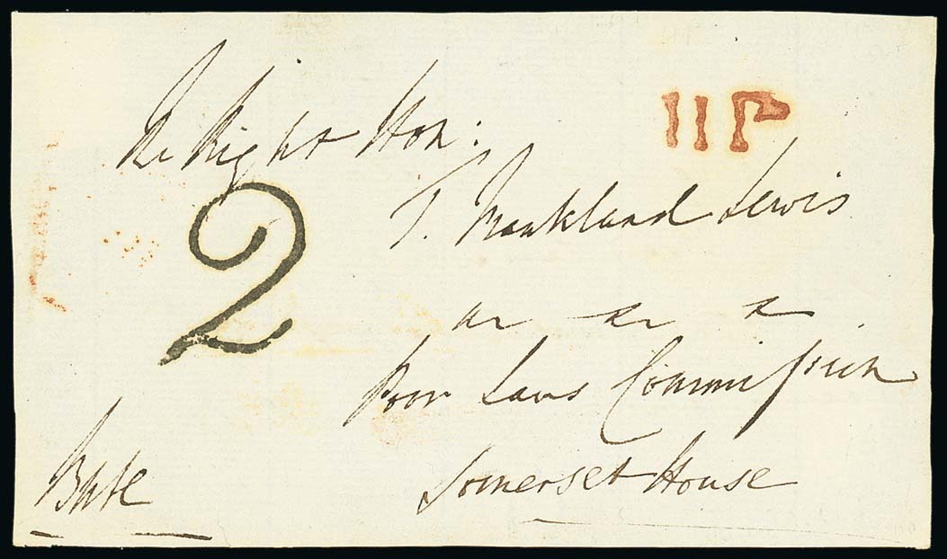 Two stampless cover fronts used within London, each bears handstruck "2" and display good strikes of the small and large "H:P" handstamps in red. The fronts are signed by the Marquess of "Bute" and Lord Chief Justice "Wynford". (2 pieces). Photo