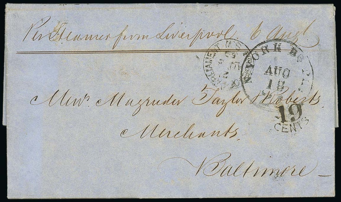 1859 (5 Aug.) stampless entire letter to Baltimore, "Per Steamer from Liverpool, 6 Aug" bearing a good strike of "houses of parliament/s.w." c.d.s. code "2" with "19/cents" accountancy handstamp in black and "n.york br. pkt./24" c.d.s. (18.8), charged 24c., and with a further Houses of Parliament c.d.s. on the reverse. The letter sent by William Scholefield on his late father's business. A very desirable cover which is believed to be the only example of this c.d.s. on overseas mail from the Houses of Parliament. Photo