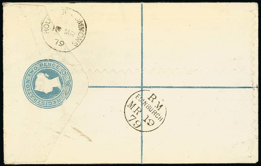1879 (18 Mar.) Q.V. 2d. registered envelope uprated 1d. plate 207 to Edinburgh, the 1d. tied by indistinct barred oval with "registered/london" dated oval below, the reverse with a good strike of "house of commons" c.d.s. with Edinburgh arrival. Fresh and fine. Photo