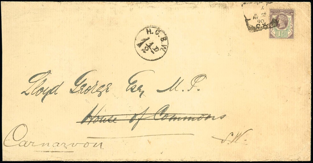 1890 (12 Apr.) large envelope addressed to Lloyd George, House of Commons, bearing Jubilee 1½d. tied by Charing Cross squared circle, readdressed to Carnarvon, the cover bears a superb strike of "h.c.s.w./1½d" postage due handstamp, the reverse with Carnarvon (13.4) and Criccieth (14.4) c.d.s. Slightly reduced at left with some creasing and soiling. Rare as this is thought to be the only example recorded. Photo
