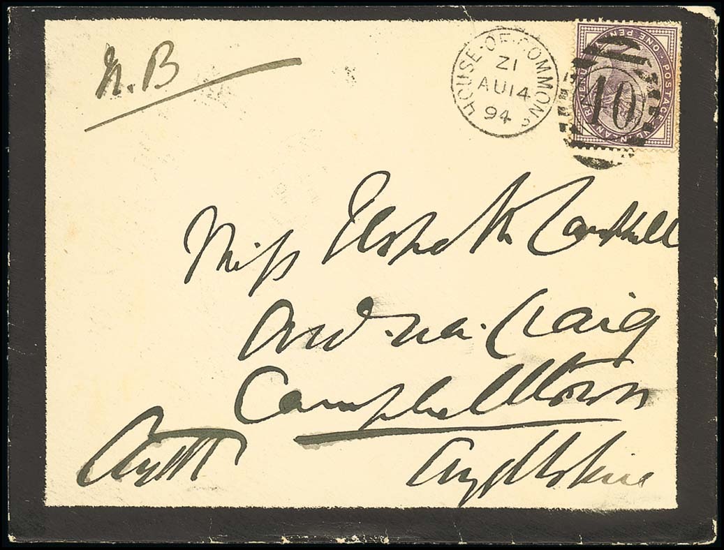 1894 (14 Aug.) mourning envelope (flap missing) to Campbelltown bearing 1d. lilac tied by a fine strike of House of Commons duplex code "Z1", signed "Argyll" and bearing Greenock and part Campbelltown c.d.s. on the reverse. Photo