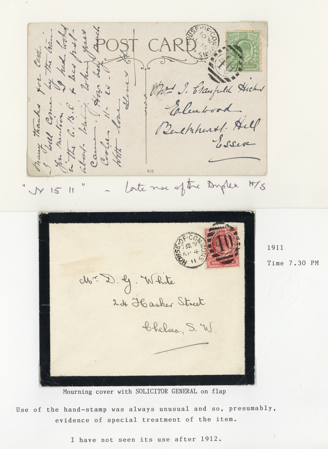 1911 (4 Apr.) mourning envelope of the Solicitor General to Chelsea bearing K.E.VII 1d. and 1911 (15 June) picture post card of trams on Lewisham High Road bearing K.E.VII ½d.; both tied by the House of Commons duplex with time codes (phased introduction after 1894); fine. (2 covers)
