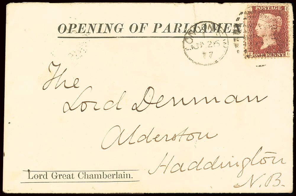 1877 (26 Jan.) envelope headed "opening of parliament" and sent from the Lord Great Chamberlain bearing 1d. plate 187 (corner defect when placed on envelope) cancelled by London S.W. duplex and addressed to Lord Denman, Haddington; the flap with the Chamberlain's embossed arms. Horizontal crease at top and some wrinkling, possibly unique. Photo