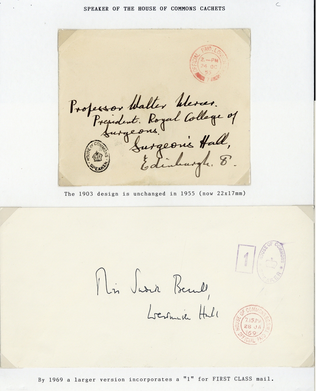 A collection of recent covers including Black Rod (with enclosure), Speaker (5), Postmaster, Clerk of the Parliament, Lord Great Chamberlain (2) and a Charles Taylor special courier stamp on envelope which he introduced during the 1971 postal strike. (12 covers)