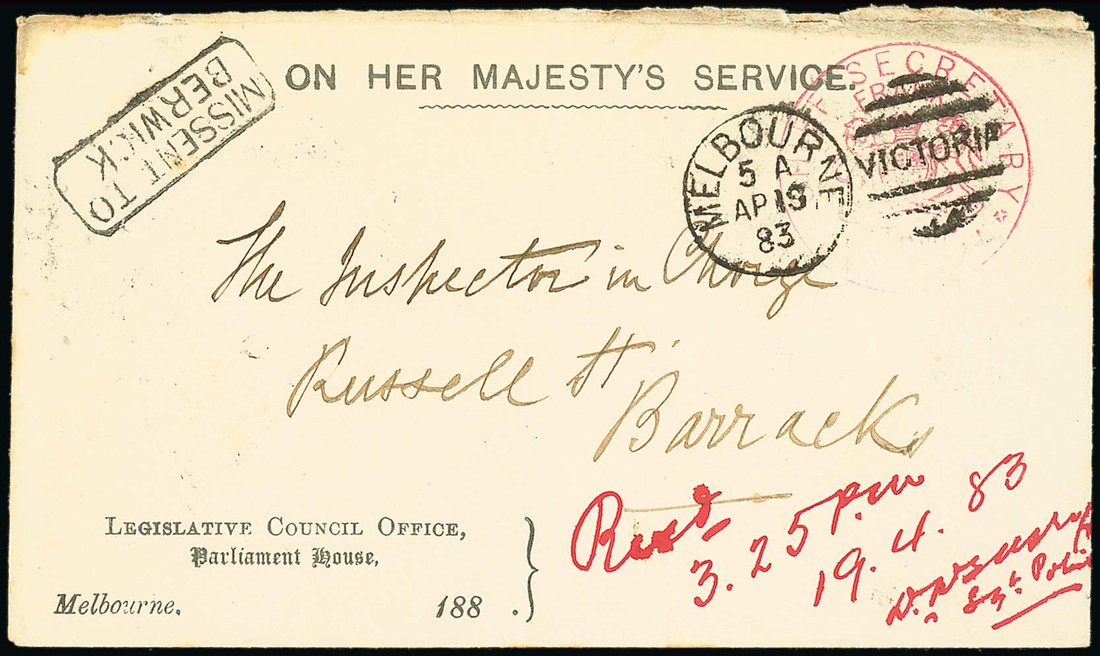 1883 (19 Apr.) O.H.M.S. envelope from the Legislative Council Office to the Inspector in Charge, Russell St. Barrack, bearing Chief Secretary Frank Stamp in red cancelled by Melbourne duplex and bears a fine strike of the boxed "missent to/berwick", the reverse with Berwick and Melbourne c.d.s. Scarce. Photo