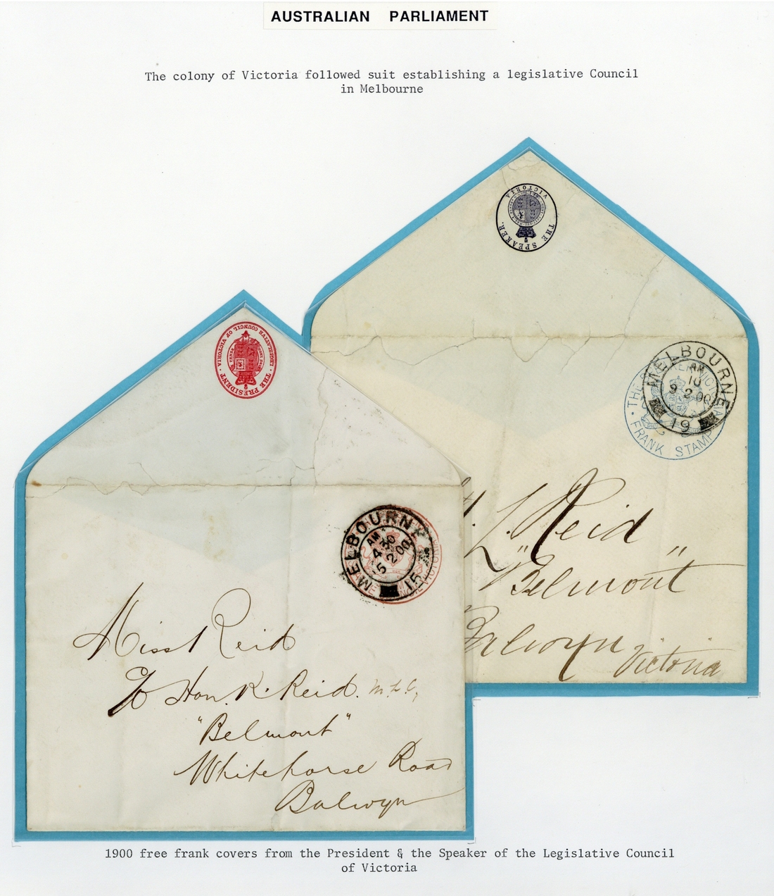 1896-1900, a group of Frank Stamps with The Treasurer in black on 1896 Parliamentary Debates wrapper, The Speaker in blue on 1896 and 1900 envelopes (the first with flap missing) and The President Stamp Council in red, all cancelled by Melbourne c.d.s. (4 covers)