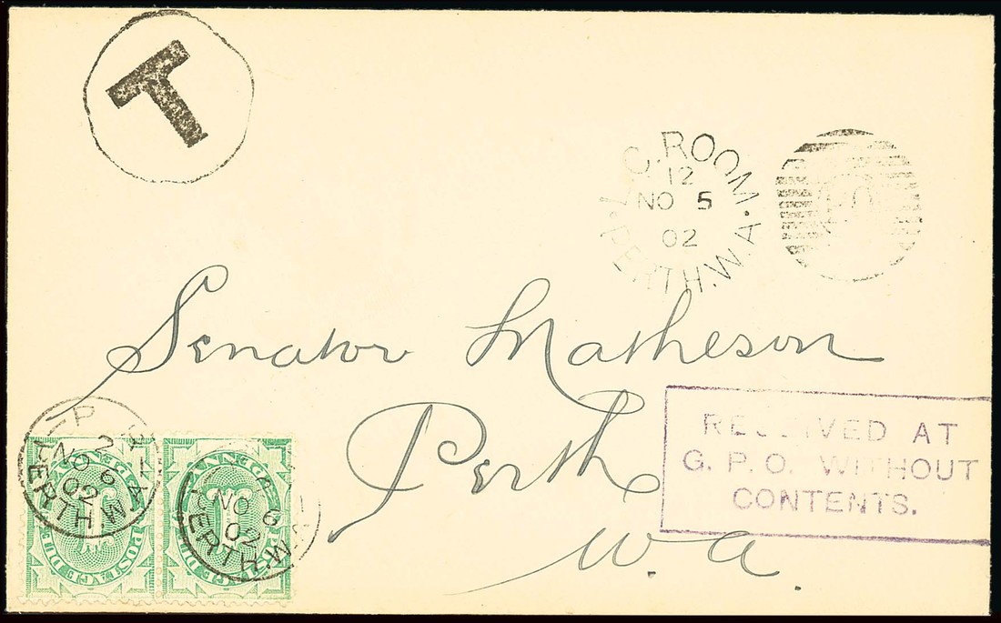 1902 (5 Nov.) stampless envelope to Senator Matheson bearing a good strike of "l.c.room/perth w.a." duplex, large "T" in circle and pair of 1d. Postage Due tied by "p r/perth w.a." c.d.s. and a boxed instructional mark "received at/g.p.o. without/contents.". Fresh and fine. Photo