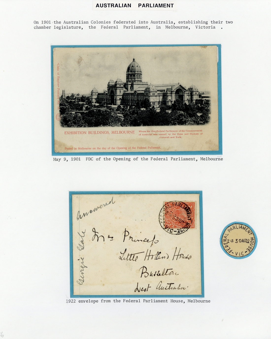 A miscellaneous selection of items which includes Federal Parliament House c.d.s. (2 sizes), Parliament House c.d.s., 1905 envelope and headed letter from The Senate, House of Representatives, plus some electorial notices. (10 items)