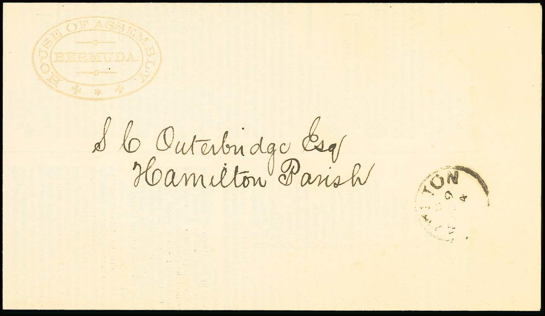 1894 (9 Aug.) stampless printed entire to S.C. Outerbridge being an abstract of the proceeding of the House of Assembly, bearing a neat strike of double-oval "house of assembly/bermuda" and Hamilton c.d.s. Fresh and very fine. Photo