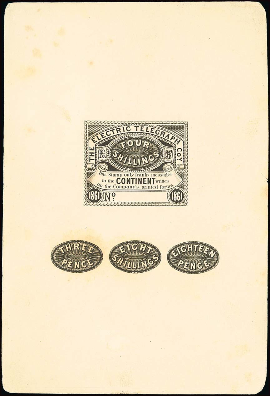 1861 Continental service; 4/- die proof in black on India paper on soft card (80 x 118mm) with additional value tablets for 3d., 8/- and 18d.; engraved by Jeans. A few minor tone spots and surface rub at foot, well clear of the designs. A rare and important telegraph proof. Photo