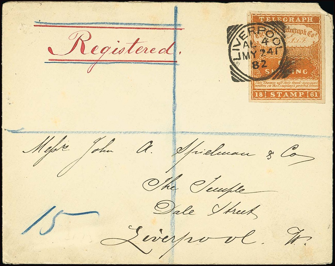 1861 imperforate remainder of 1/- without control number, well tied on local Liverpool registered envelope by 1882 (24 May) squared circle; tiny corner fault. Very unusual usage. Photo