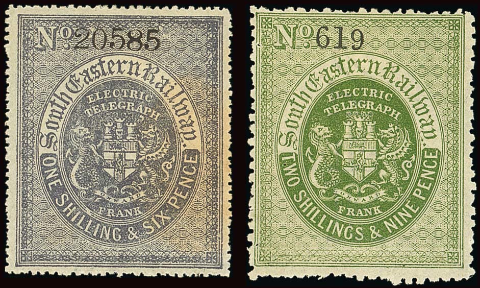 In September 1860 the South Eastern Railway, then the third largest telegraph network in Britain, began to issue "Electric Telegraph Franks". These were printed by Charles Whiting, Beaufort House, Strand, London. Some of the values are very scarce and it is thought that only 30 examples of the 2/9d. value were produced