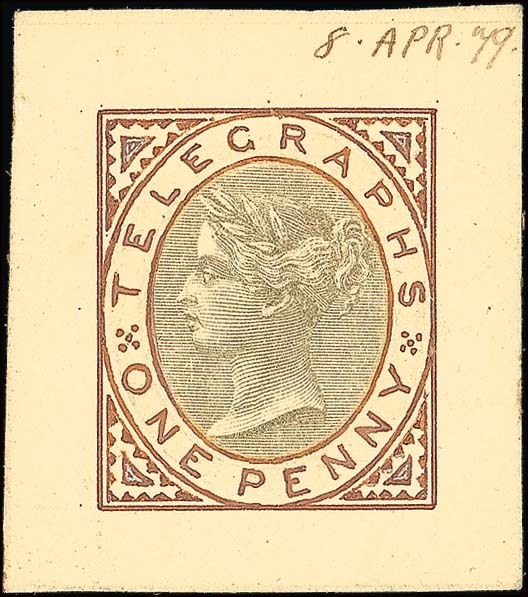 De la Rue essay for the series B; 1d. with head in pale grey with hand-painted surround in brown on buff card (29x33mm) and dated "8 apr 79". Fine and rare. Cat £5500. Photo