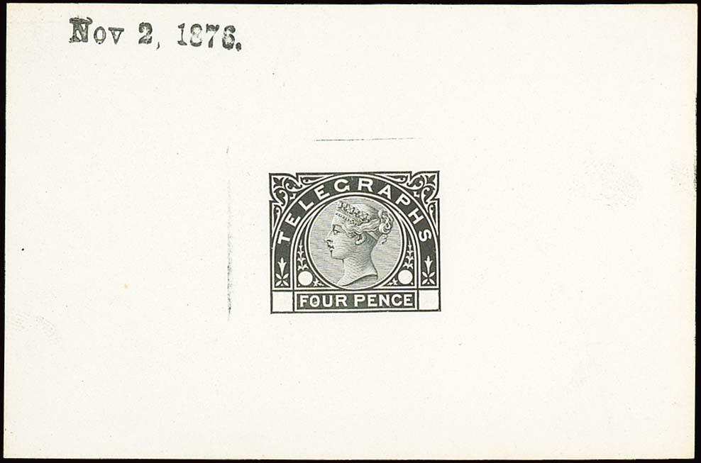 4d. die proof in black on glazed card, marked "Nov 2, 1876."; fine. Cat £800. Photo