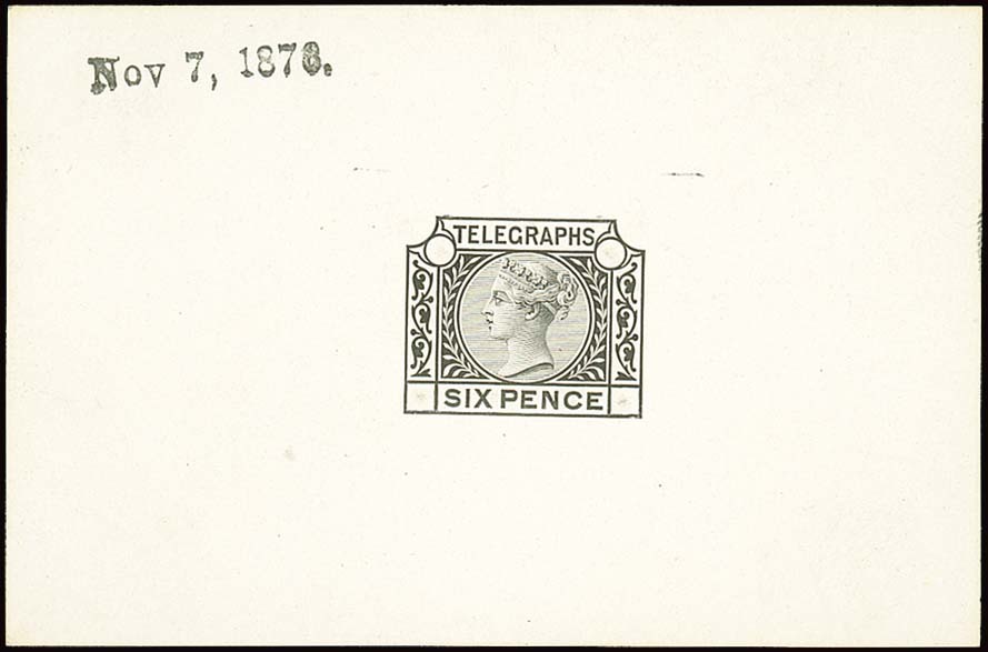 6d. die proof in black on glazed card showing squares in lower corners, marked "Nov 7, 1876."; fine. Cat £800. Photo