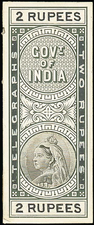 2r. a composite die proof comprising 1890 2r. 8a. cut down die proof in black on glazed card with the mourning head of Queen Victoria (touched up to complete the circular design) with handpainted value and side panels; adherences on the reverse. Unique. Photo