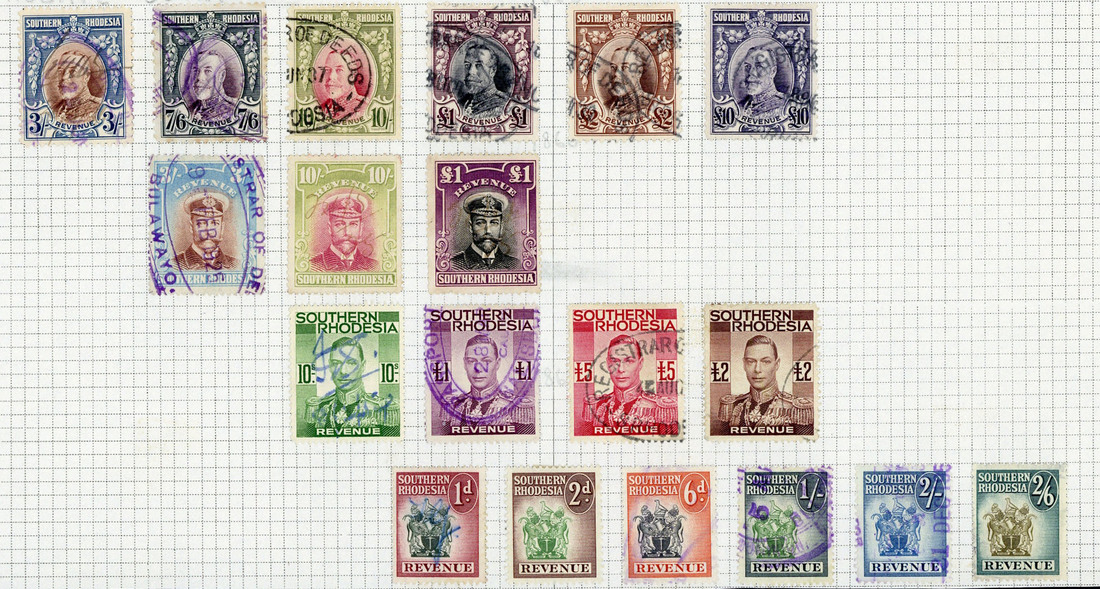 1896 £50 on £2 red (faults, rare), 1896 Arms £50, 1897 Arms £50 and £100, 1898 £5, £10 and £20, and 1903 £30, and a range of Postage stamps (55) used fiscally with values to £20; also Northern Rhodesia (15) with K.G.V £30, Southern Rhodesia (23) and Postage stamps (9) used fiscally