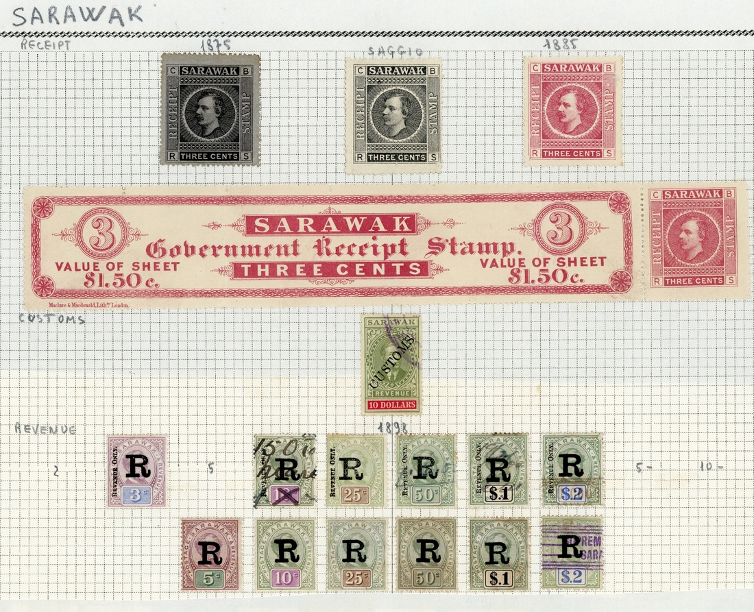 A selection with Customs 1924 $10, Receipt 1875 3c. black (2) and 1885 3c. rose (2, one attached to "Government Receipt Stamp" sheet label) and Revenue (22) with "revenue only" values to $2, later stamps to $10, and Postage stamps (4) used fiscally