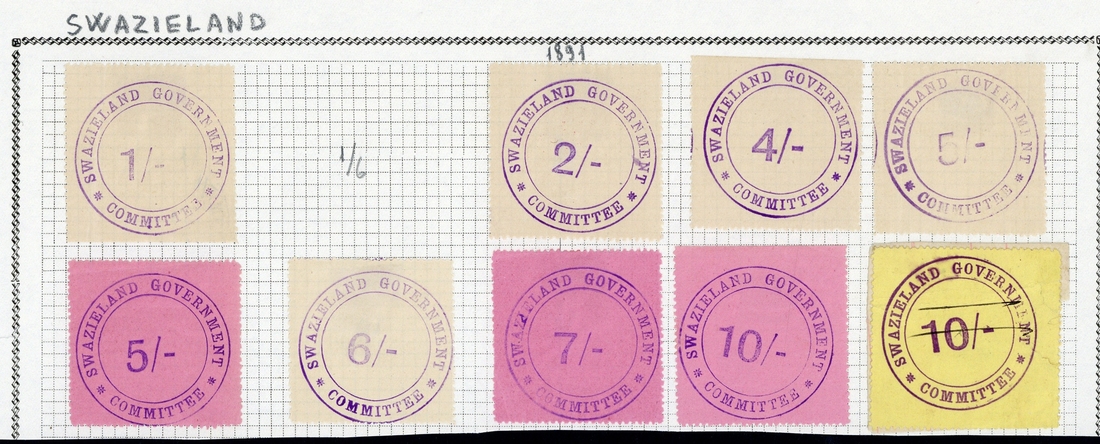 1890 1/-, 2/-, 4/-, 5/- and 6/- on straw, 5/-, 7/- and 10/- on rose, all mint, and 10/- on yellow pen-cancelled; a fine and scarce group. Barefoot cat. £565, the last is unlisted