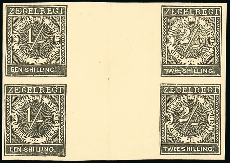 1875 1/- with 2/- interpanneau block of four plate proofs in black on wove paper from the 3rd and 4th rows of the pane, the left-hand pair of the 1/- value and the right-hand pair of the 2/- value; horizontal and vertical creases though a rare and previously unrecorded proof block. Photo