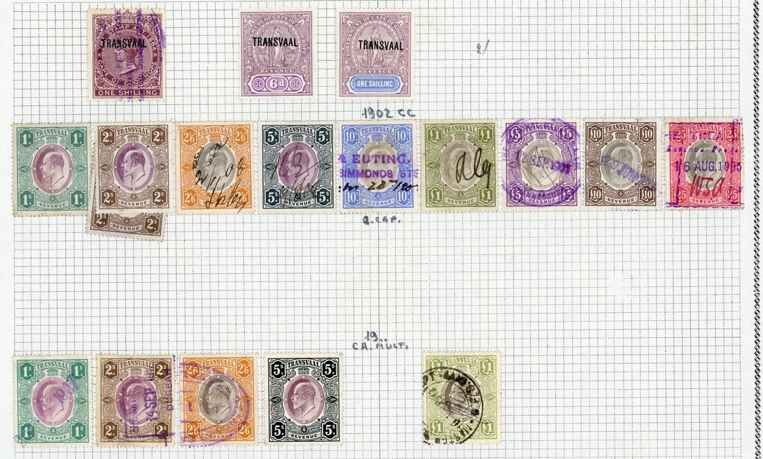 1902 on Cape 6d. and 1/- mint, 1902 on Cape Queen 1/- used, 1902 K.E.VII CC 1/- to £25 and 1906 CA 1/- to £1, used; also Customs (8), Customs Frank Fee (6, one unused) and Pass (5); generally good to fine. Barefoot cat. £500+