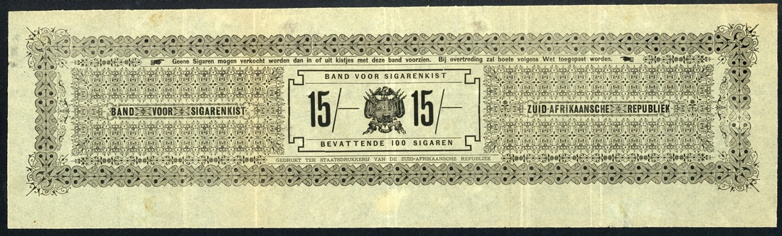 Cigar Bands in black on pale dull green paper 390x110mm. with Arms and value at centre, comprising 3/9d. for 25 cigars, 7/6d. for 50 cigars and 15/- for 100 cigars; some creasing though a remarkable and very rare trio