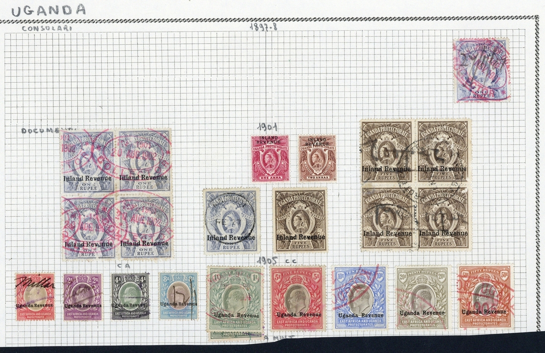 A collection (93) including 1898 1r. and 5r. singles and blocks of four, on East Africa and Uganda 1905-07 CA/CC to 50r. and CA to 10r., 1912 selection to 20r., 1918 values to 75c., 1918 vertical overprint on 1r. to 5r., 1922 values to £1 and K.G.VI values to £1 (2); also a small selection (12) of Tanganyika with 1950 10c. to 20/- and Postage stamps (7) fiscally used