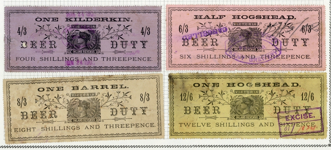 1890 Imported Beer in Kegs 3d. pink, 3d. brown, 1/3d., 4/3d., 6/3d., 8/3d. and 12/6d., 1895 Beer in Kegs 3d. brown; 3d. pink and 1/3d. unused, the others used; a few faults in places as to be expected on items of this nature. Barefoot cat. £600