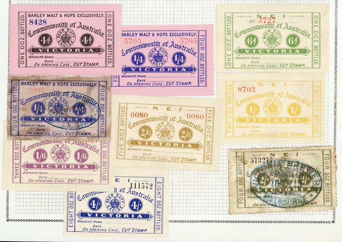 1903 Beer in Bottles inscribed "barley malt & hops exclusively", imperforate 4d. and 1/4d. mint and perforated 1/4d. well used; Imported Beer in Bottles headed "n.e.i.", imperforate 6d., 1/-, 1/6d., 2/6d. and 4/- mint and perforated 2/- well used