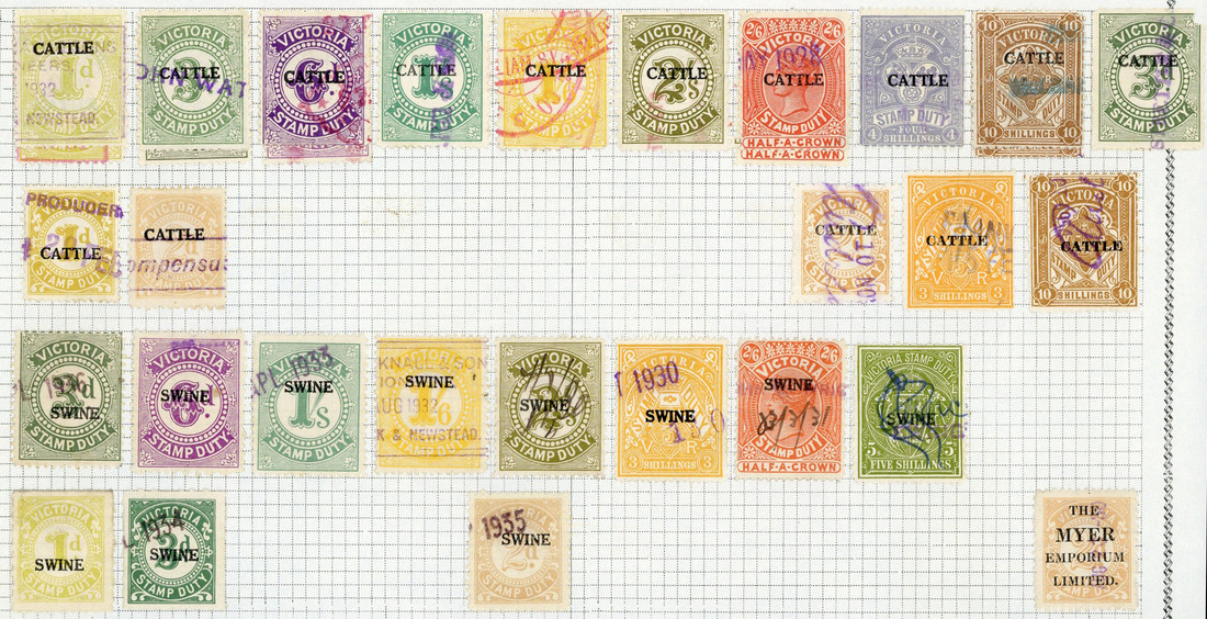 A miscellaneous selection with Cattle (20), Motor Transfer (2), Stamp Duty range (98) with values to £10, £25-£100 engraved and £25-£100 litho, Stamp Duty Relief (5), Stamp Statute (29) values to £5 and 2/-, 5/-, 10/- and £1 overprinted "specimen" (15x2mm.), Swine (11) and a few others