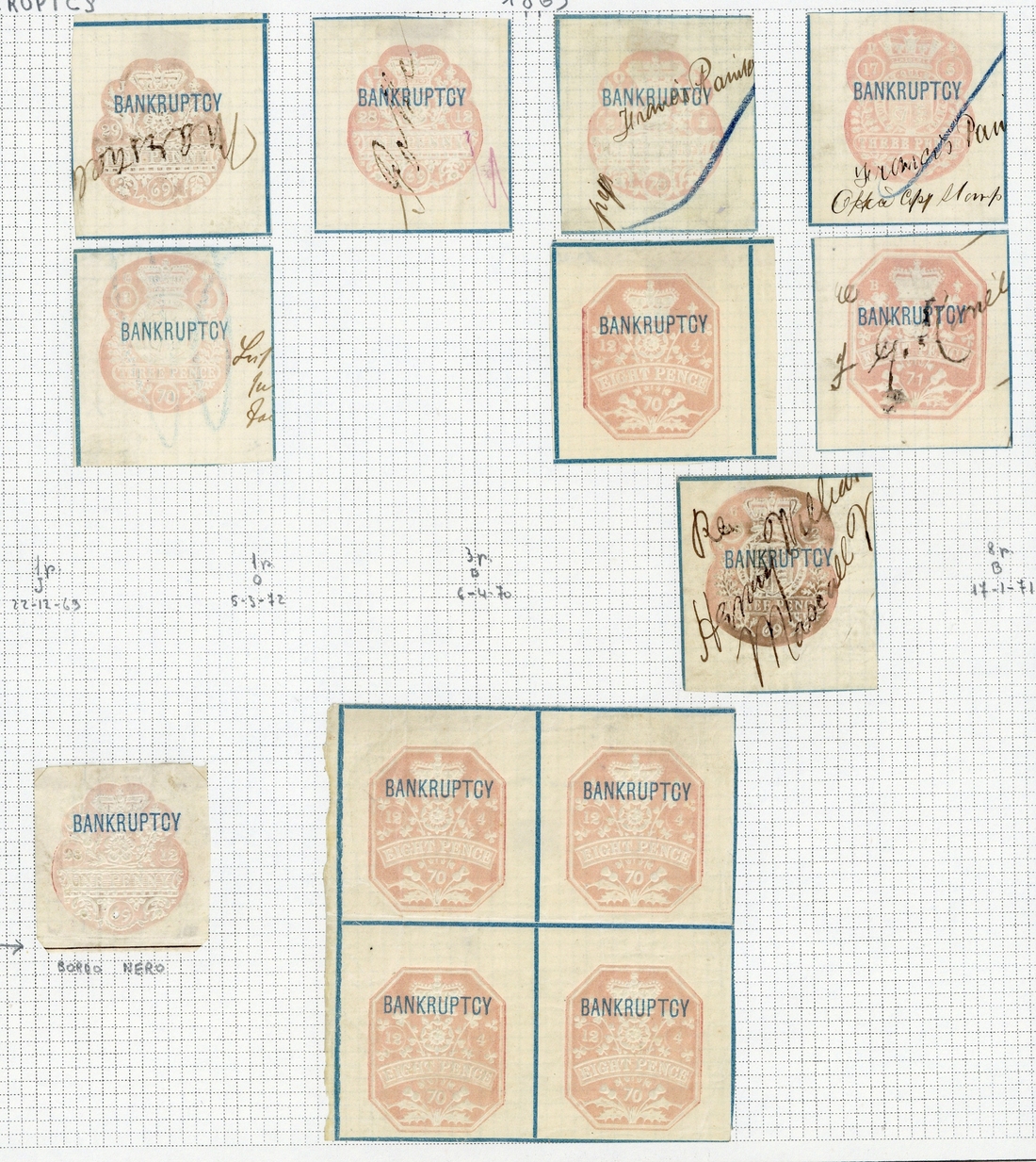A valuable collection on leaves with 1869 on white paper including unused 1d. with black border, 3d. and 8d. single and block of four; on blued paper including 1d. unused and 3d. pair; unoverprinted with values to £1 and £5; 1870 perforated values to 5/-; 1872 values to 5/- plus 1/- handstamped "specimen"; 1889 unified series with values to £20 overprinted "specimen", £5 used and a few unused; 1895 values to £2 plus a few K.E.VII; usual mixed condition. (121)