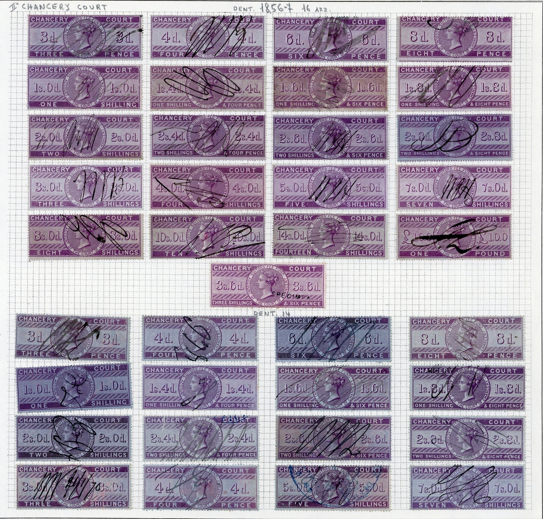 An extensive collection on leaves which includes Chancery Fee Fund 1852 values to 2/8d., a large selection of 1853 values showing different dates with values to 2/8d. (11) including 2/6d. block of four, 3d. and 2/8d. tête-bêche pairs, unused 4d. and piece with impressed 10/-; Chancery Court 1856 set to £1 used, 1857 perf.14 with 3/6d. handstamped "specimen", on blued paper set to £1 used, white paper set to £1 and violet shades with values to £1; In Chancery 1875 embossed £3 overprinted "specimen" type 9 and used. (215)