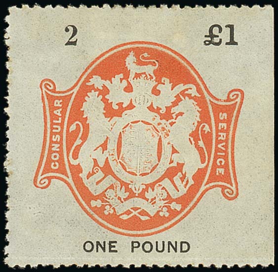 1885 £1 red and black, a perforated essay with value at foot, serial number "2", large part original gum. Rare as there are only a few copies recorded. Photo