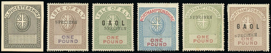 A collection on leaves with Gloucestershire 1870 values to 5/- blue and carmine, single printing with die proof in black on soft card and 2/6d. unused; Isle of Ely with 1870 set to £1 handstamped "specimen" and 1882 set to £1 handstamped "specimen", also both sets to £1 additionally printed "G A O L" and Specimen; Northamptonshire including 1870 1d. unused, 1882 Specimen set to £1 and the blue printing set to £1 used, 1874 6d. and 1/- surcharges used, 1882 Specimen set to £1 plus both sets overprinted "G A O L " and Specimen. An unusually comprehensive lot. (106). Photo