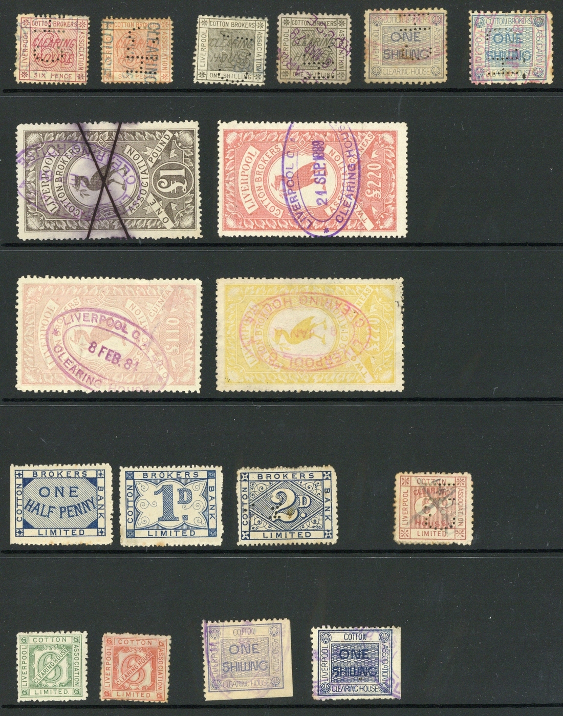 A good selection with Corn Trade 1886 2/-. 1897 imperf. plate proof of 6d. pair and 2/- (fault), used values to 4/-, serial number at top set of three, "Limd" set of three; Cotton from 1875-76 6d. (2), 1881 £1 and £2/2/0, 1883 £1/1/0 and £2/2/0; Cotton Brokers Bank values to 2d. unused or used, later issues to 1888 £1/1/0; Provisions Association 1883 1/-. Condition is mixed, useful nevertheless. (37)