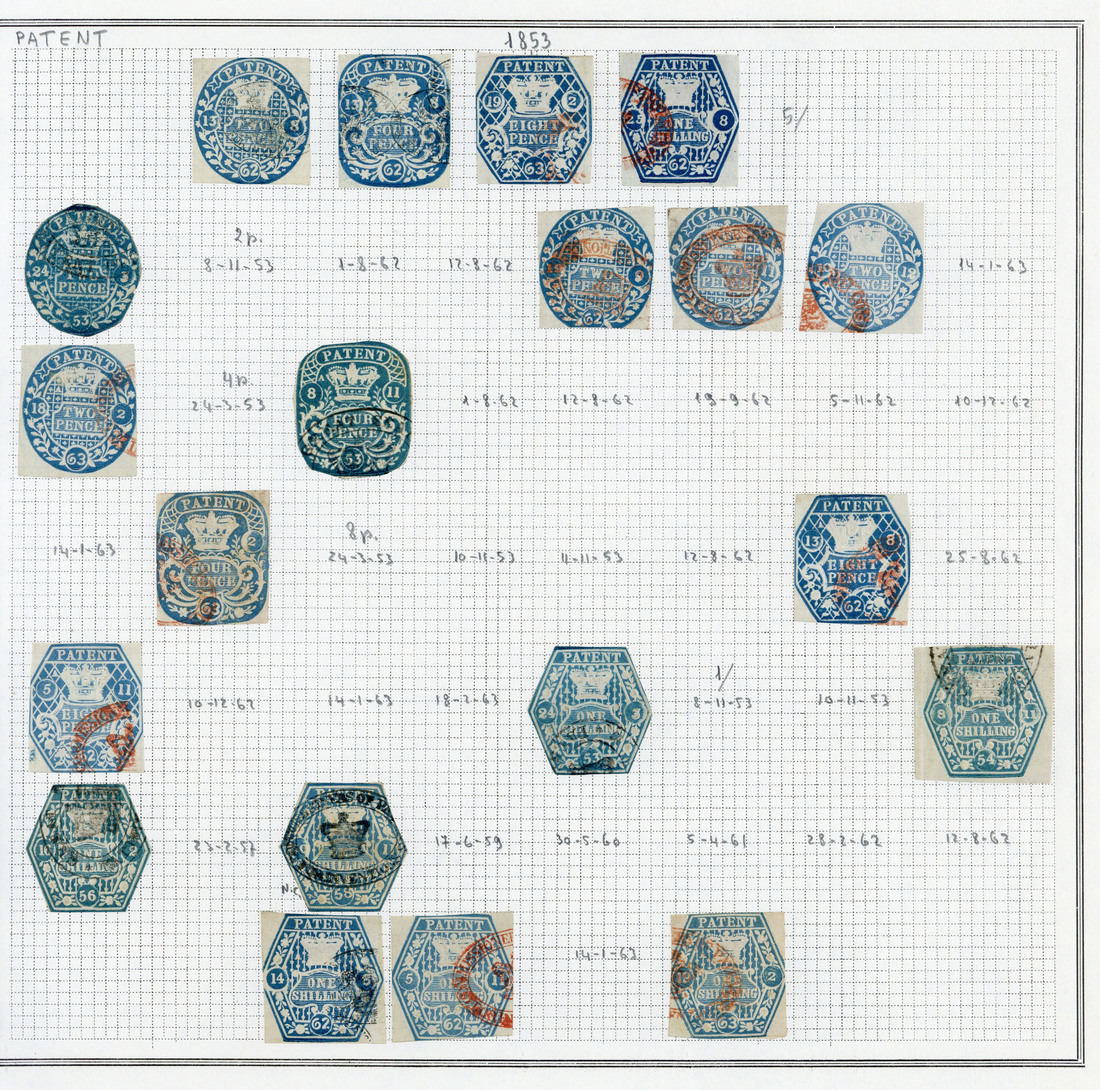 A good collection on leaves with 1853 values to 1/- (8), come cut-to-shape; 1863 with unused 4d. and used with tête-bêche pairs including 1/- block of four; 1870 values to 1/- (3) including unused 2d.; 1871 set of three to 1/-; also a group of the unified series with Specimen values to 5/-. (163)
