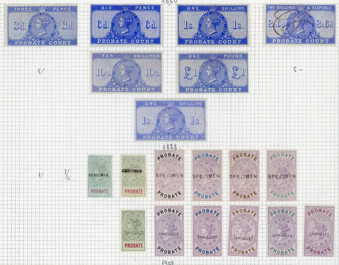 A small collection with 1858 values to 5/-; 1860 provisional 3d. unused (rare); 1860 values to 10/- plus 2/6d. to £5 handstamped "specimen"; 1860 values to 10/- and $1 unused; 1878 values to £5 handstamped "specimen" and to £6 handstamped "cancelled". A desirable group. (36)