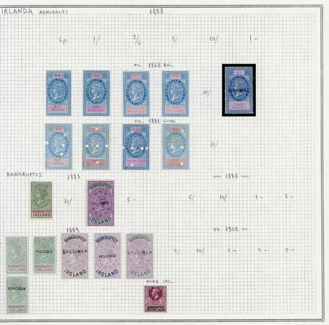 An extensive collection on leaves which includes Admiralty 1868 set to 5/- unused, 1871 Orbs set to 5/- used and £1 Specimen; Bankruptcy 1873 £1 Specimen, 1882 set to £5 overprinted Specimen; Chancery Fee Fund values to £5 with 6/2d. unused and Specimen, 1867 values to £1 ion white and on blued paper and Specimen values to £1, 1868 £3 and £5 Specimen; County Courts 1878 values to £1 Specimen, 1882 values to £1 Specimen some later issues; various Dog Licence; Judicature Fee includes 1882 values to £5, 1895 value to £5 and K.E.VII values to £5; some Land Commission; Petty Sessions 1858 6d. pink unused and used (3) and 6d. green (6), 1862 to 2/6d. and 1885 to 2/6d. unused; a selection of Marine Insurance; Records values to £1 Cancelled; Record of Title Fee with 1865 1/- and 1866 1/- and 2/6d. handstamped Specimen; Registration of Deeds with 1861 set to £1 plus pair of 2/6d., 1872 values to 10/- unused and £1 used, 1881 to £1, 1864 embossed set to 10/- and K.E.VII values to £1; Registration of Title 1890 values to £1 (2) Specimen and Insurance Fund1892 set overprinted Specimen and set Cancelled, 1896 2/- unused. A very good collection. (391)