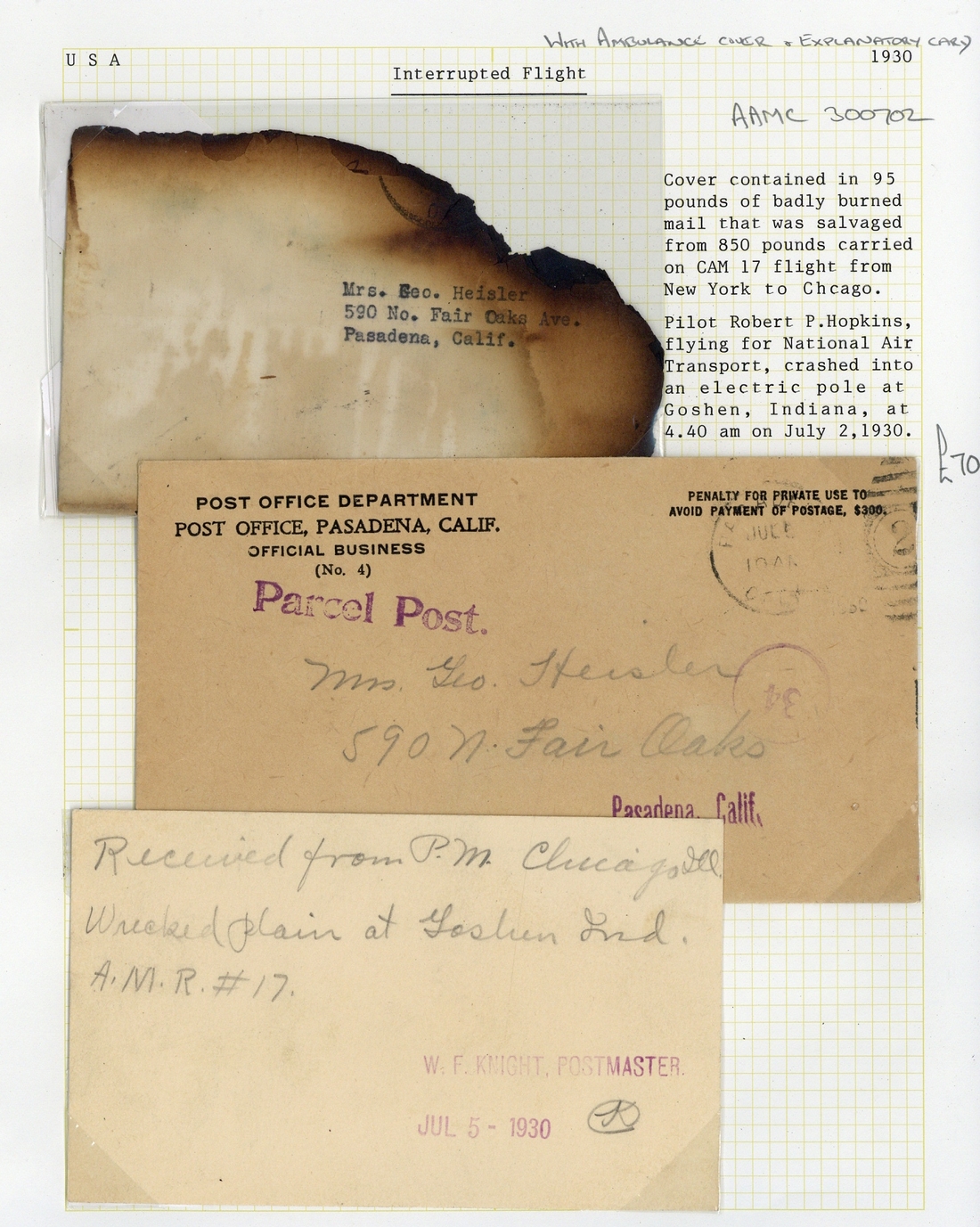 1930 U.S.A. covers with 1930 envelope from New York to Pasadena, badly burnt and with "ambulance" envelope bearing handstamp "Parcel Post" in purple and card from the postmaster dated 5th July with manuscript " Received from P.M. Chicago, Ill. Wrecked plain at Goshen Ind. A.M.R.#17"; also 1930 (Dec.) envelopes (2) to California bearing handstamps "damaged by air plane wreck/december 22, 1930" applied at Alhambra and struck of red or purple; typical soiling. (3 covers)