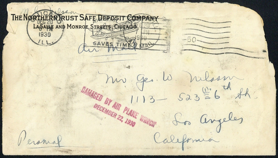 1930-55 group of U.S.A. covers with 1930 (20 Dec.) commercial envelope from Chicago to Los Angeles showiing "damaged by air plane wreck/december 22, 1930" in red; 1934 (Dec.) commercial envelope from New York to Chicago showing "damage due to/air mail interruption/at/buffalo ny/dec 19 1934" in purple; 1938 (28 Nov.) envelope from Oregon to California showing "damage due to air mail/interruption near/pt. reyes, calif/nov 29 1938" in black; 1949 (12 Dec.) envelope from Wilson to San Diego showring "damaged in plane crash/washington d c/dec.12 1949" in mauve; 1955 (16 Dec.) envelope showing "damaged in plane crash/hollywood, c.s. 12/17/55" in purple; 1955 (15 Dec.) envelope from Boston to Florida with two strikes of "damaged in plane crash" in purple. Also 1945 envelope from U.S. Army P.O. in Germany to Buffalo (roughly opened but with enclosure) showing "damaged in/plane crash" in black. (7 covers)