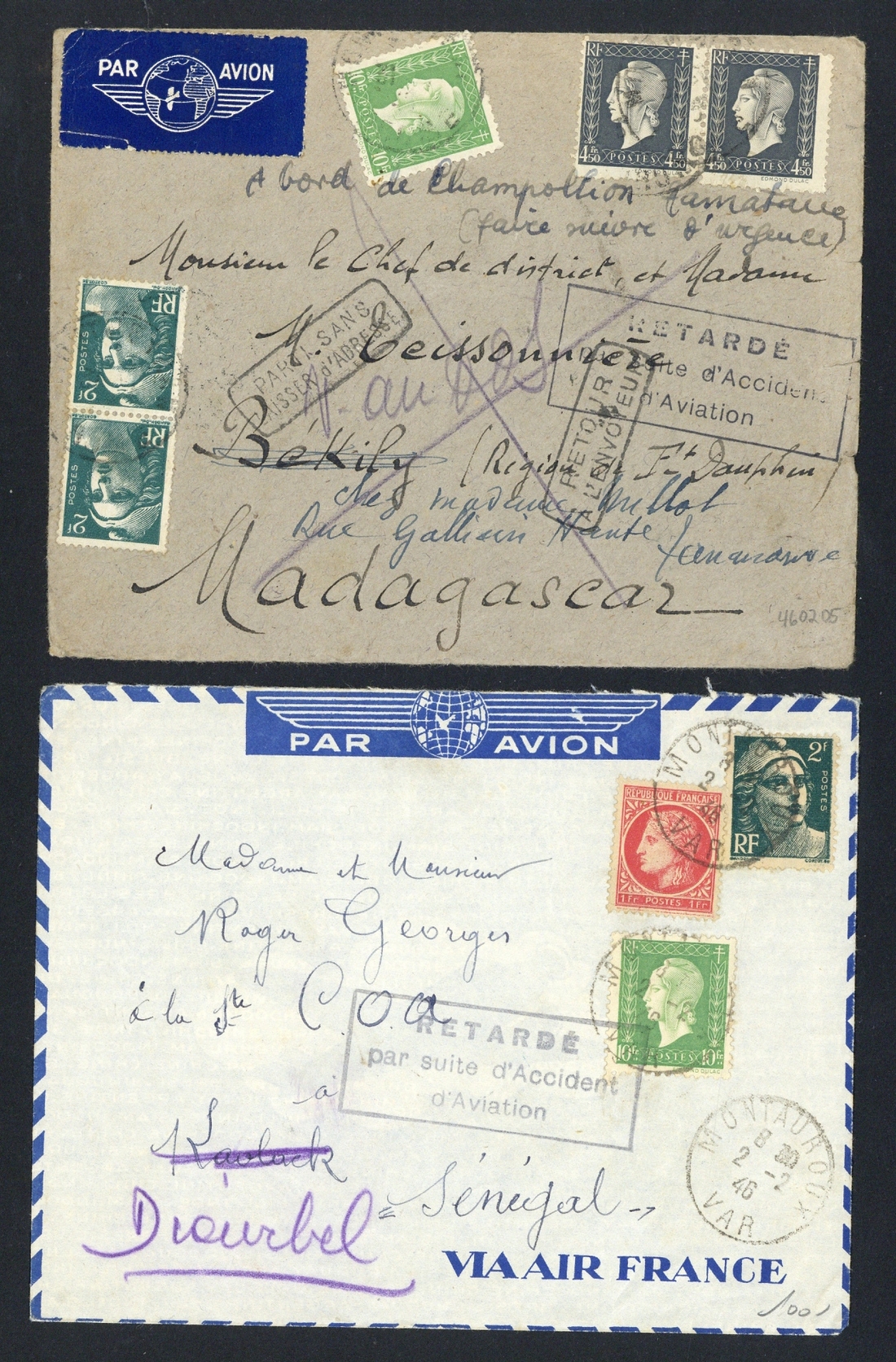 1935-46 group of French covers and cards with 1935 (16 Feb.) special card on the attempted non-stop flight to Argentina with "raid interrompu ..." cachet; 1946 (2 Feb.) Air France envelope to Senegal which was forced to land at Minorca where the mail was considerably delayed and with boxed "retardé/par suite d'accident/d'aviation" in black; another cover from the same flight to Madagascar with the same boxed cachet, redirected and with additional boxed handstamps "parti sans/laisservd'adresse" and "retour/a l'envoyeur". (3 covers)