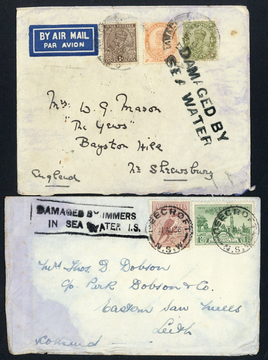 1936 (22 Aug.) Imperial Airways 'Scipio', a group of covers showing several different handstamps with type g "damaged by/sea water" from India to Shrewsbury; type i boxed "damaged by immers... /in sea water i.s." on envelope from Australia to Leith; similar on reverse of long envelope from India to Kent but with the complete handstamp; type r label on envelope from India (Monghyr) to Holland and type x boxed "damaged by/sea water/in airplane/accident" in violet on envelope from Palestine to Glasgow. A good varied group. (5 covers)