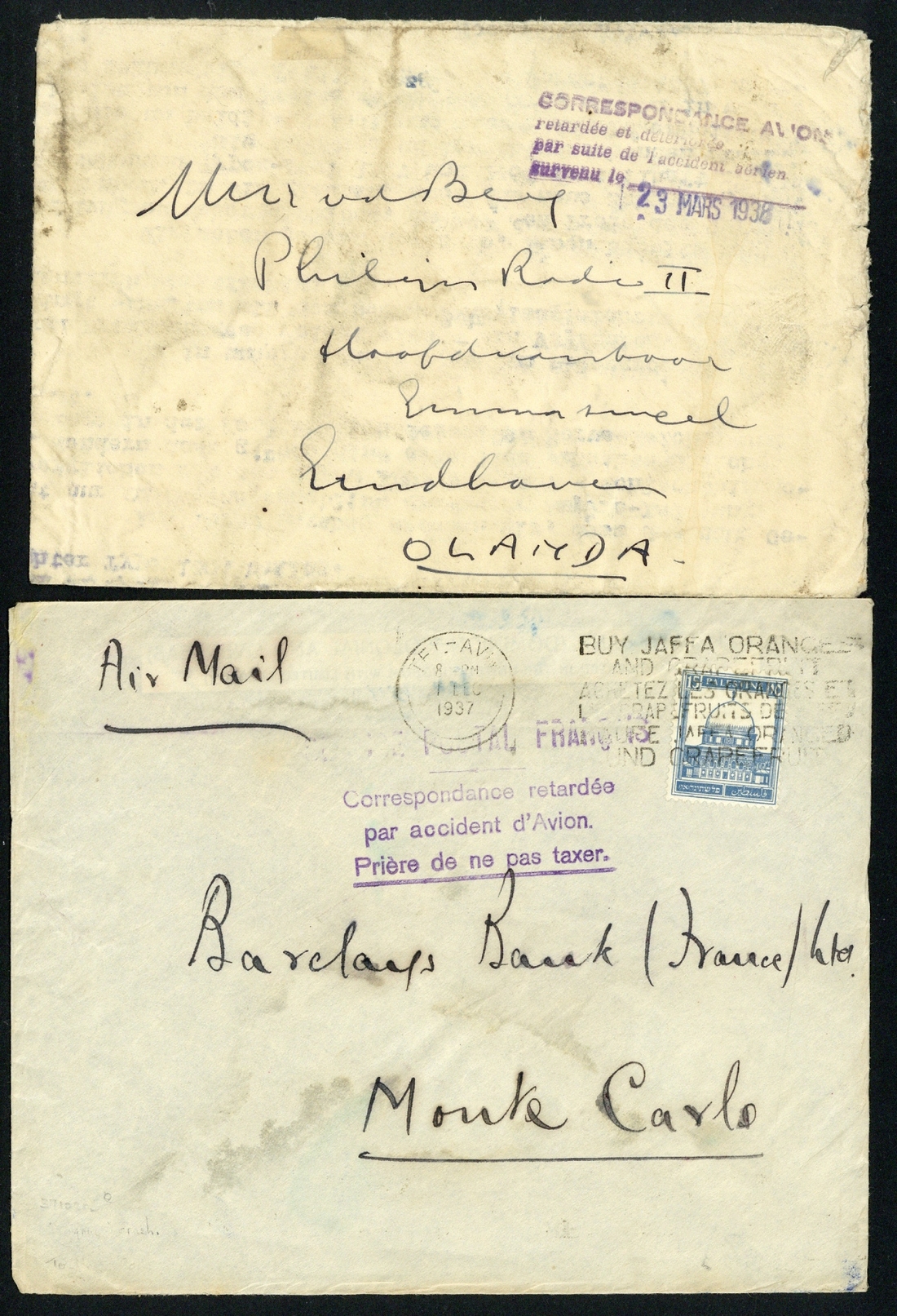 1937 (1 Dec.) 'Cygnus' envelope from Tel Aviv to Monte Carlo with a good strike of the type u cachet, the reverse with French Post Office seal, and 1938 (Mar.) envelope from Rio de Janeiro which was carried on the Air France flight which crashed into the Pyrénées and showing a good strike of the type a cachet. (2 covers)