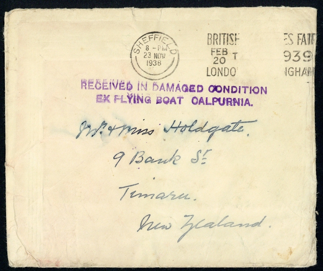 1938 (Nov.) 'Calpurnia' covers (2) which crashed in Iraq, with envelope from Sheffield to New Zealand bearing a fine strike of the type a cachet and envelope from London to Melbourne with the type kk printed explanation pinned to the envelope
