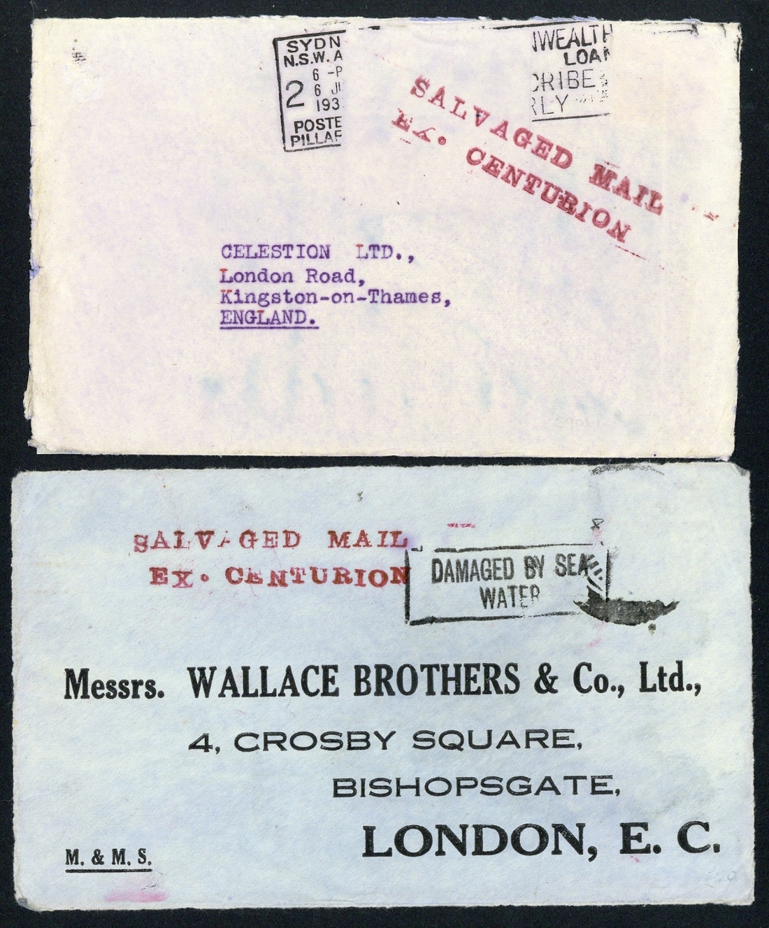 1939 (June) 'Centurian' crash, commercial envelope from Sydney to Kingston-on-Thames showing a superb strike of the type a handstamp in carmine, and a printed cover from to London bearing a fine strike of the type d handstamp in carmine plus type f "damaged by sea/water" handstamp in black. Nierinck 390612. (2 items)