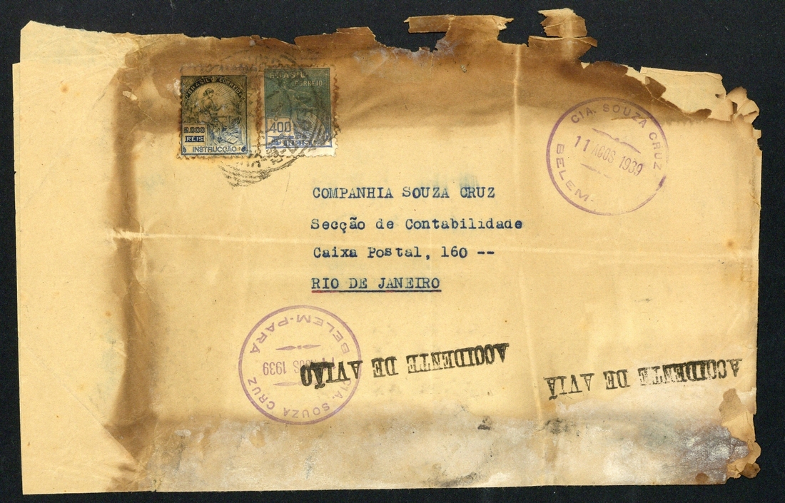 1939 (11 Aug.) two large envelopes to Rio de Janeiro, both showing two strikes of the straight-line "accidente de avião" in black, both internal Brazil covers with one from Souea Cruz which is quite badly burnt, the other is soiled and shows some burn marks on the reverse. (2 covers)
