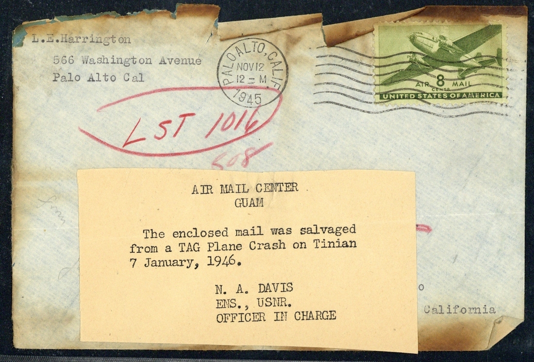 1945 (12 Nov.) envelope from Paloalto to the Fleet Post Office, San Francisco, bearing 8c. air franking, marked "LST 1016" and, on route to its new destination, burnt around the edges and with printed label, "air mail center/guam/the enclosed mail was salvaged/from a tag crash on Tinian/7 January, 1946./n. a. davis/ens., usnr./officer in charge". Unusual and not listed by Nierinck