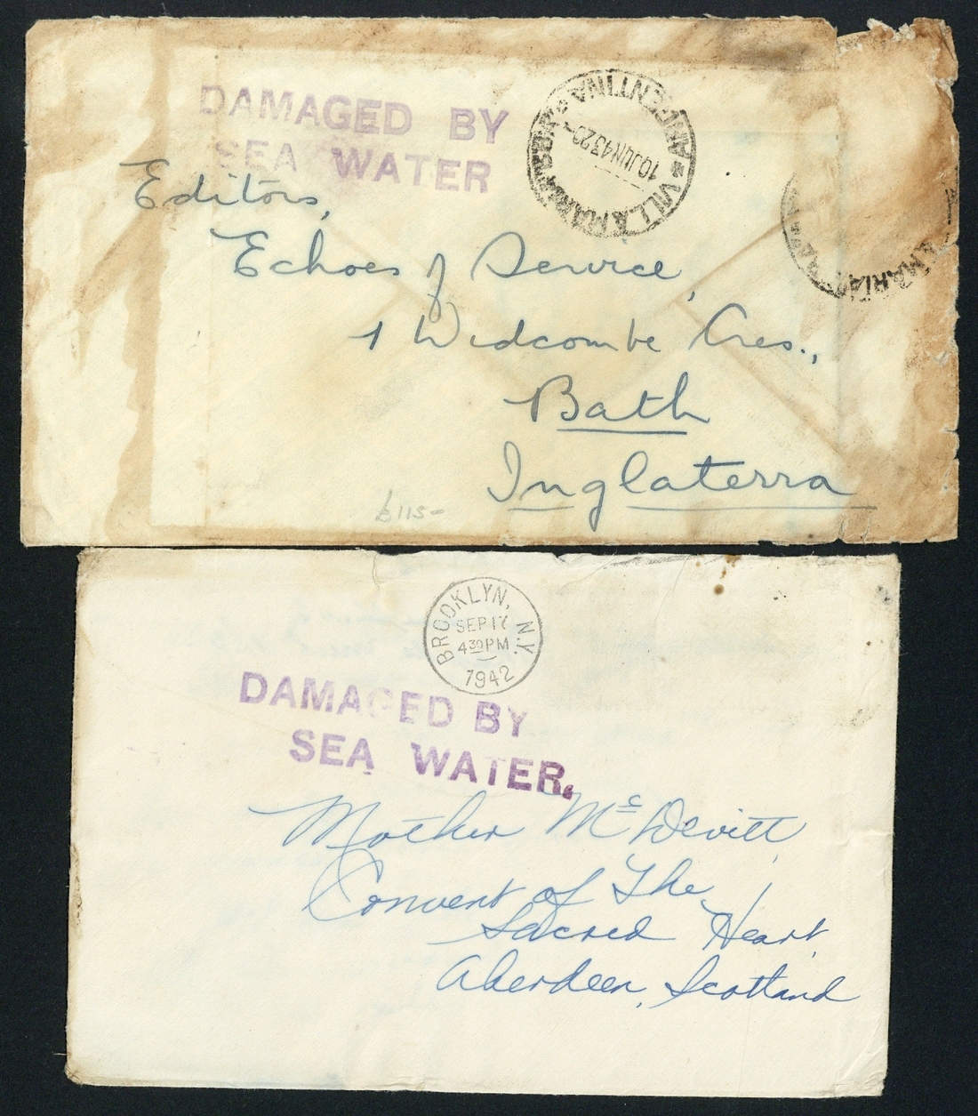 1942 (17 Sept.) envelope from Brooklyn, New York to Aberdeen, without adhesive or flap and bearing a fine strike of "damaged by/sea water." in violet, and 1943 (10 June) envelope from Argentina to Bath bearing a similar handstamp in violet; soiled and with Post Office seals on the reverse. (2 covers)